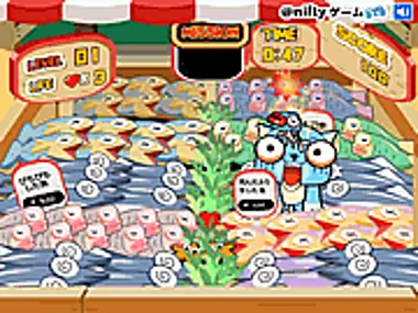 These cats are in the fish market and want to eat all the fish. Click them with the mouse so that they don't finish off the market's goods.