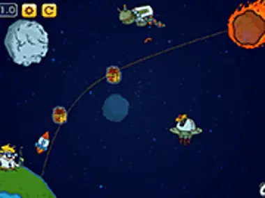 Drag dots to set the rockets course. Grab TNT before hitting the asteroid to win.
