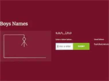 Guess the BoysNames Hangman הוא משחק html5 מהנה שתוכלו לשחק בו אונליין בחינם. מטרת המשחק פשוטה: פשוט נסו לנחש את השמות והימנעו מלהיתלות. שחקו ובדקו אם שמכם נמצא במשחק. תהנו!