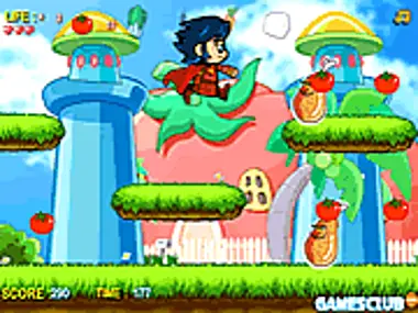 In this game you have to defeat the mean drumsticks and other pieces of meat by jumping on them. But watch out that you don't walk into them, because then you'll lose a life. Eat vegetables to get more Super Power.